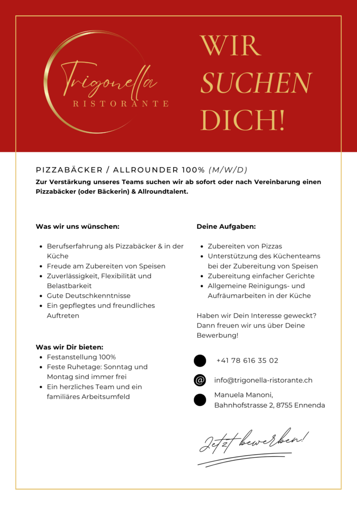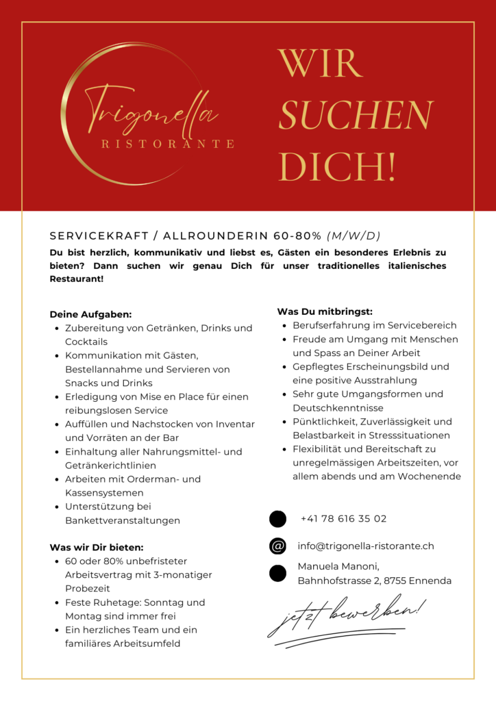 Hier findest du alle freien Stellen im Ristorante Trigonella in Ennenda. Aktuell nichts Passendes dabei? Dann sende uns gerne deine Blindbewerbung an info@trigonella-ristorante.ch – wir freuen uns auf dich!